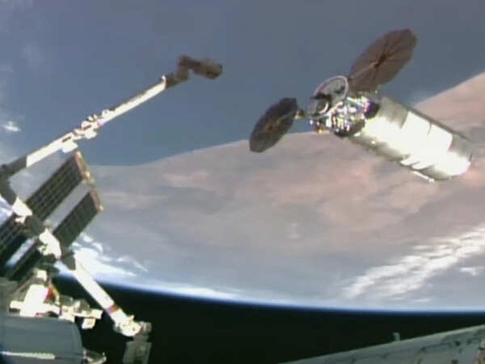 This image provided by NASA shows Northrop Grumman's newly arrived cargo capsule at the International Space Station on Thursday, Sept. 18, 2025.